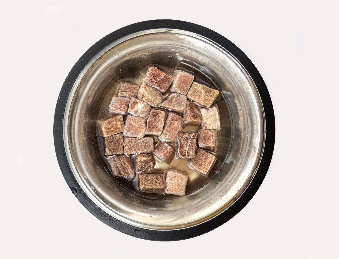 Будь то сухое, замоченное или как топпинг—каждый кубик сделан из 100% сублимированного мяса, полон вкуса и питательных веществ. Ни одного наполнителя, ни одного искусственного ингредиента—просто настоящее мясо.